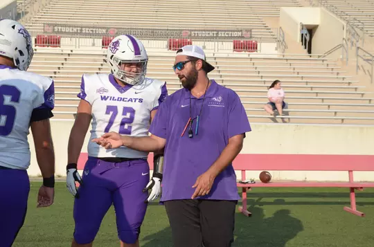Jeberaeel and his assistant (former ACU tight end) Mason Hite enjoy a positive rapport with their players as they go through drills on a comfortable sunny morning at Wildcat Stadium. Everyone’s moving at a moderate pace. There are times to take it slow, and occasions to show a bit more intensity.